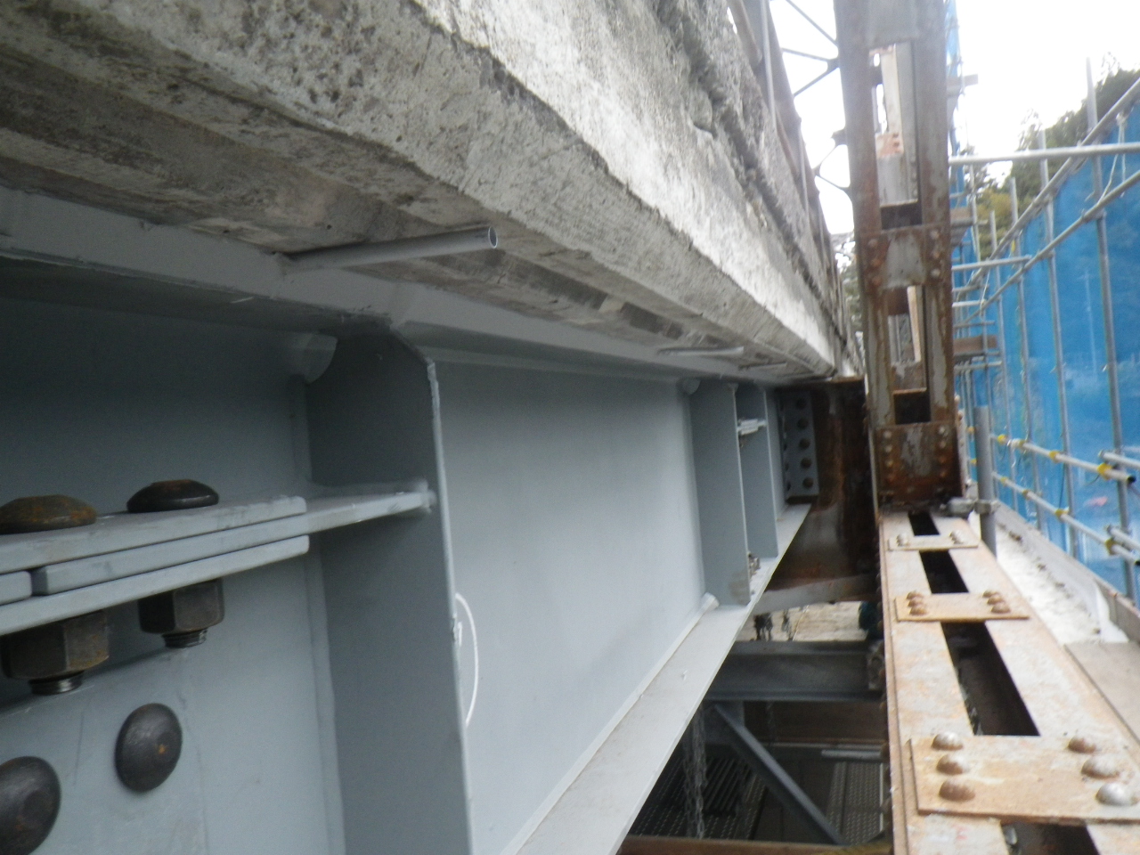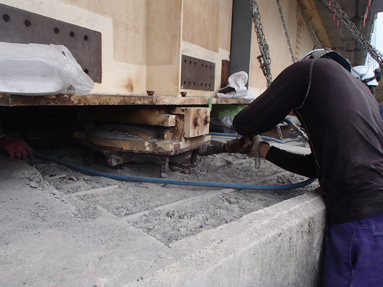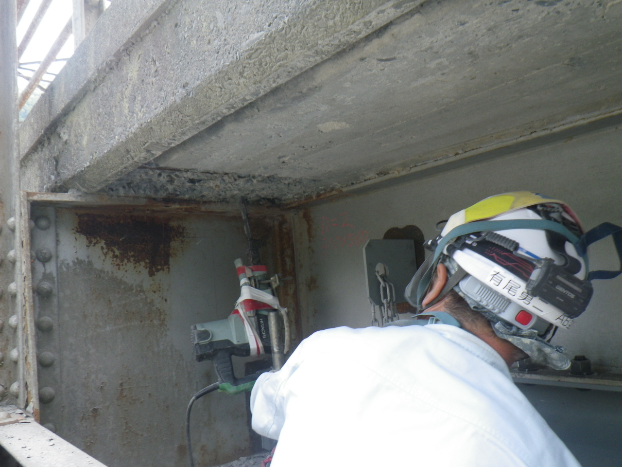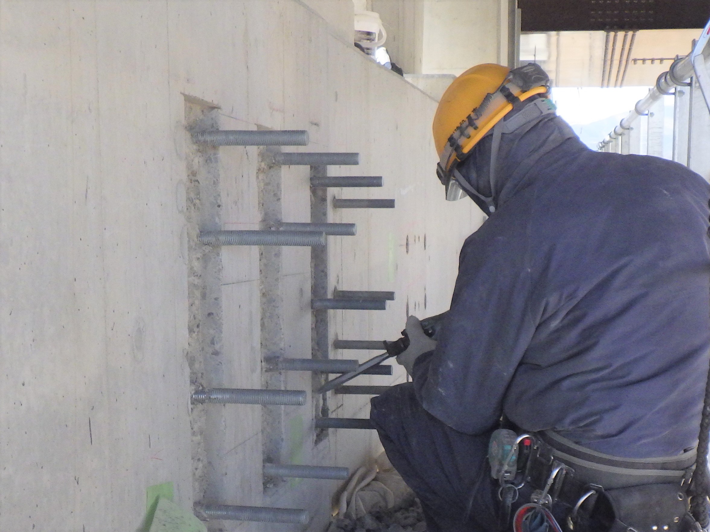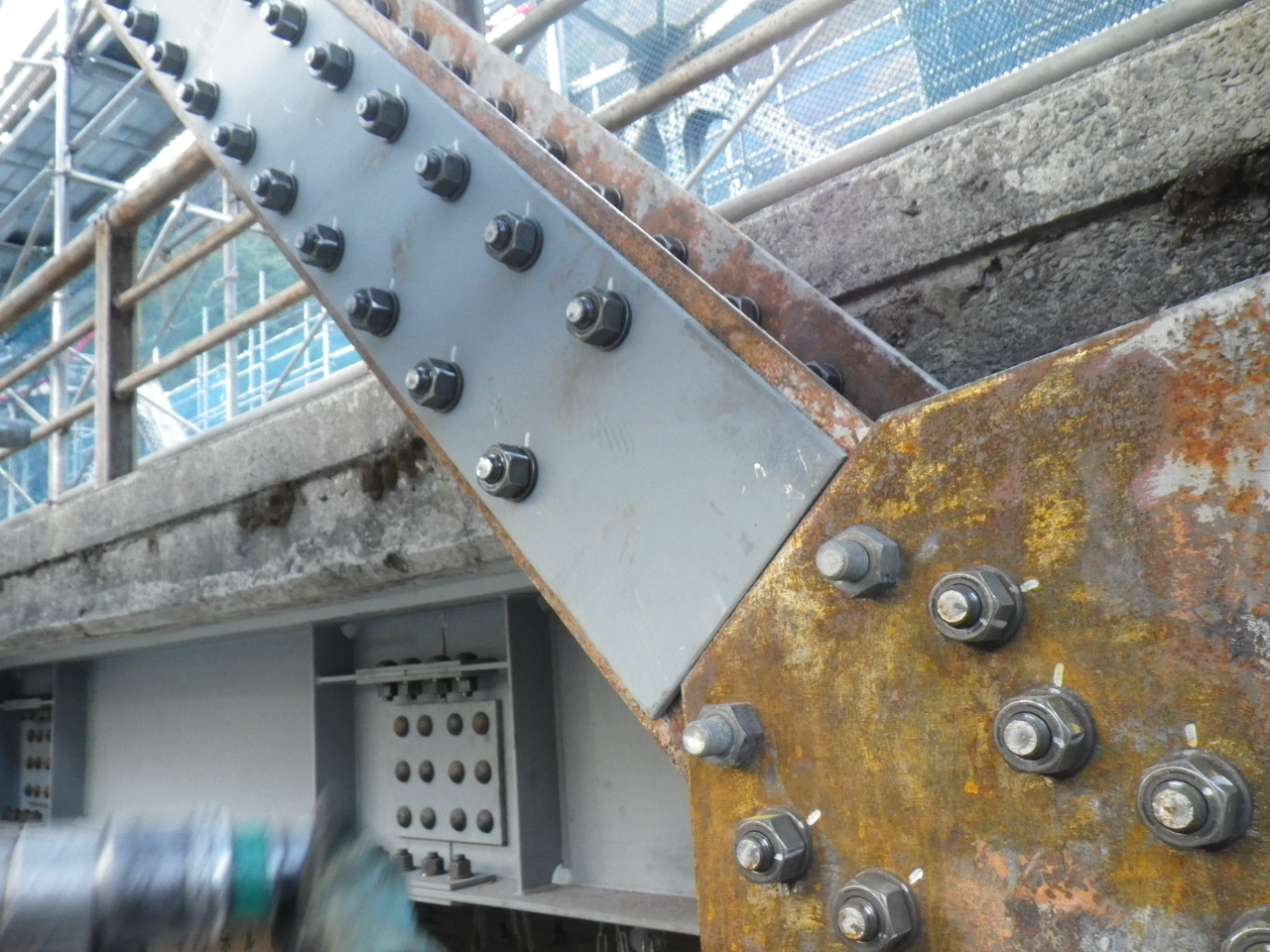 技術内容 橋体補強工 _ 当て板補強 鋼部材が腐食等により減厚したり断面欠損を生じた個所を取り囲むように当て板をあて、補強を行う ▲上部へ戻る 各種繊維シート接着による補強工 炭素繊維・アラミド・剥落防止シートなど各種繊維シートを用いた耐震補強・接触・近接爆発に対する補強・欠落落下防止などを行う ▲上部へ戻る コンクリート構造物補強工 _ ひび割れ注入補修工 コンクリート構造物のひび割れ幅や補修目的に応じ、ひび割れ部に合った材料・工法を選定し注入する。 ▲上部へ戻る 橋体補強工 _ 構造変更による補強工 状況に応じた鋼部材の応力の低減を計る為、補強部材の取付を行う。 ▲上部へ戻る 橋体補強工 _ 鋼鈑接着による補強工 構造物の曲げ・せん断耐力、変形性能を向上させる為、既設構造物に鋼板をあてがい、隙間にモルタル及びエポキシ樹脂を注入する。 ▲上部へ戻る 橋体補強工 _ 支承取替工 経年劣化・機能回復や耐震性能の向上を目的として、既設の支承を取り替える工法 ▲上部へ戻る 橋体補強工 _ 拡幅工 地震の際に橋桁がずれたり、落下しないように各装置を設置。震災時、桁が橋脚や橋台上で進行方向に移動し落下することを防ぐため、桁掛かり 部分を進行方向に増し打ちし拡幅する。 ▲上部へ戻る コンクリート構造物補強工 _ コンクリート脆弱部断面修復工 コンクリート構造物の劣化状況を調査し、劣化部分を斫り撤去し劣化状況に応じた断面修復材にて断面修復を復元する。 ▲上部へ戻る 断面修復工 ▲上部へ戻る 橋体補強工 _ リベット取替工 ▲上部へ戻る 補強用ケーブル設置工 ▲上部へ戻る