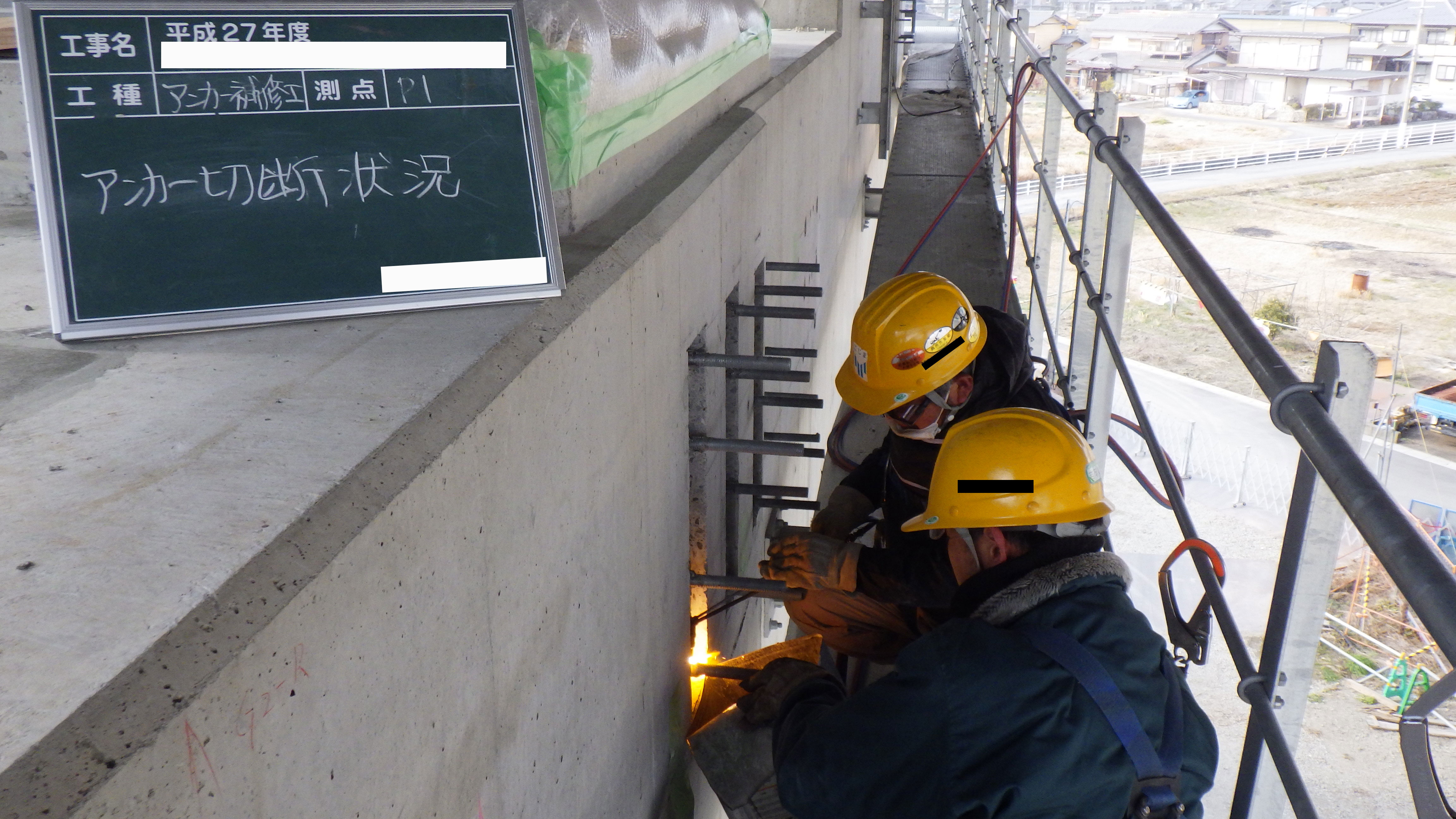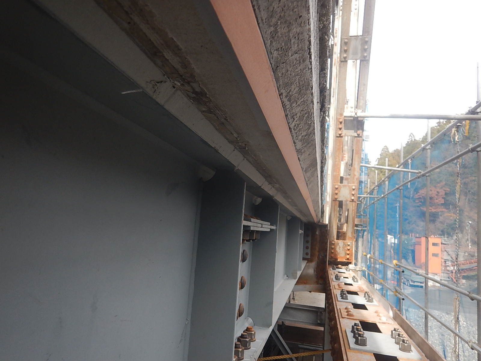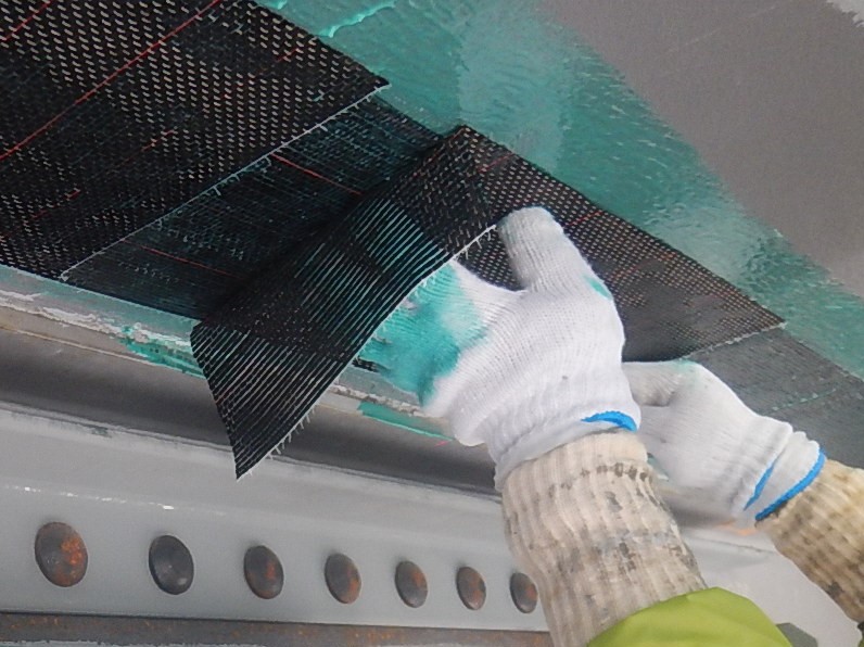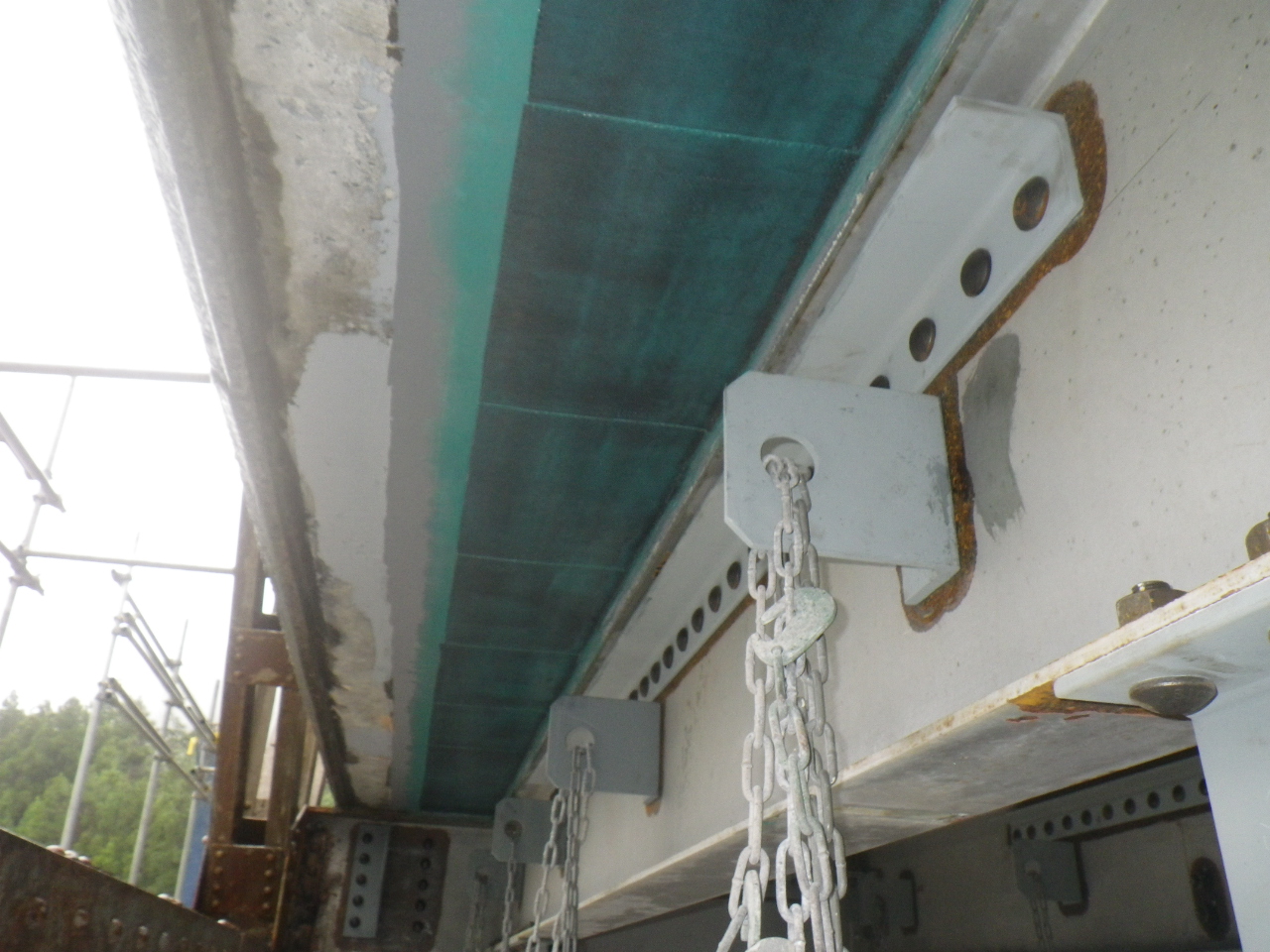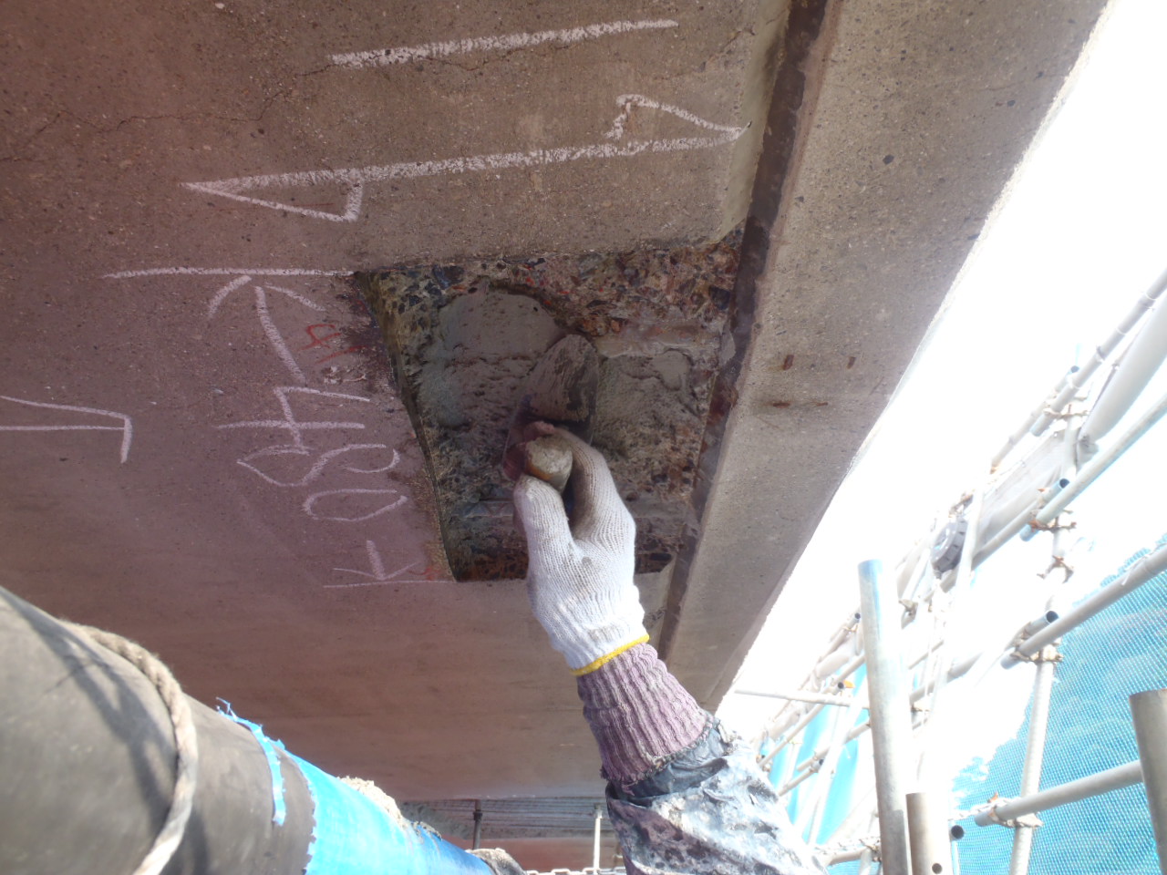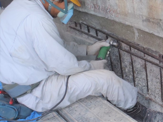 技術内容 橋体補強工 _ 当て板補強 鋼部材が腐食等により減厚したり断面欠損を生じた個所を取り囲むように当て板をあて、補強を行う ▲上部へ戻る 各種繊維シート接着による補強工 炭素繊維・アラミド・剥落防止シートなど各種繊維シートを用いた耐震補強・接触・近接爆発に対する補強・欠落落下防止などを行う ▲上部へ戻る コンクリート構造物補強工 _ ひび割れ注入補修工 コンクリート構造物のひび割れ幅や補修目的に応じ、ひび割れ部に合った材料・工法を選定し注入する。 ▲上部へ戻る 橋体補強工 _ 構造変更による補強工 状況に応じた鋼部材の応力の低減を計る為、補強部材の取付を行う。 ▲上部へ戻る 橋体補強工 _ 鋼鈑接着による補強工 構造物の曲げ・せん断耐力、変形性能を向上させる為、既設構造物に鋼板をあてがい、隙間にモルタル及びエポキシ樹脂を注入する。 ▲上部へ戻る 橋体補強工 _ 支承取替工 経年劣化・機能回復や耐震性能の向上を目的として、既設の支承を取り替える工法 ▲上部へ戻る 橋体補強工 _ 拡幅工 地震の際に橋桁がずれたり、落下しないように各装置を設置。震災時、桁が橋脚や橋台上で進行方向に移動し落下することを防ぐため、桁掛かり 部分を進行方向に増し打ちし拡幅する。 ▲上部へ戻る コンクリート構造物補強工 _ コンクリート脆弱部断面修復工 コンクリート構造物の劣化状況を調査し、劣化部分を斫り撤去し劣化状況に応じた断面修復材にて断面修復を復元する。 ▲上部へ戻る 断面修復工 ▲上部へ戻る 橋体補強工 _ リベット取替工 ▲上部へ戻る 補強用ケーブル設置工 ▲上部へ戻る