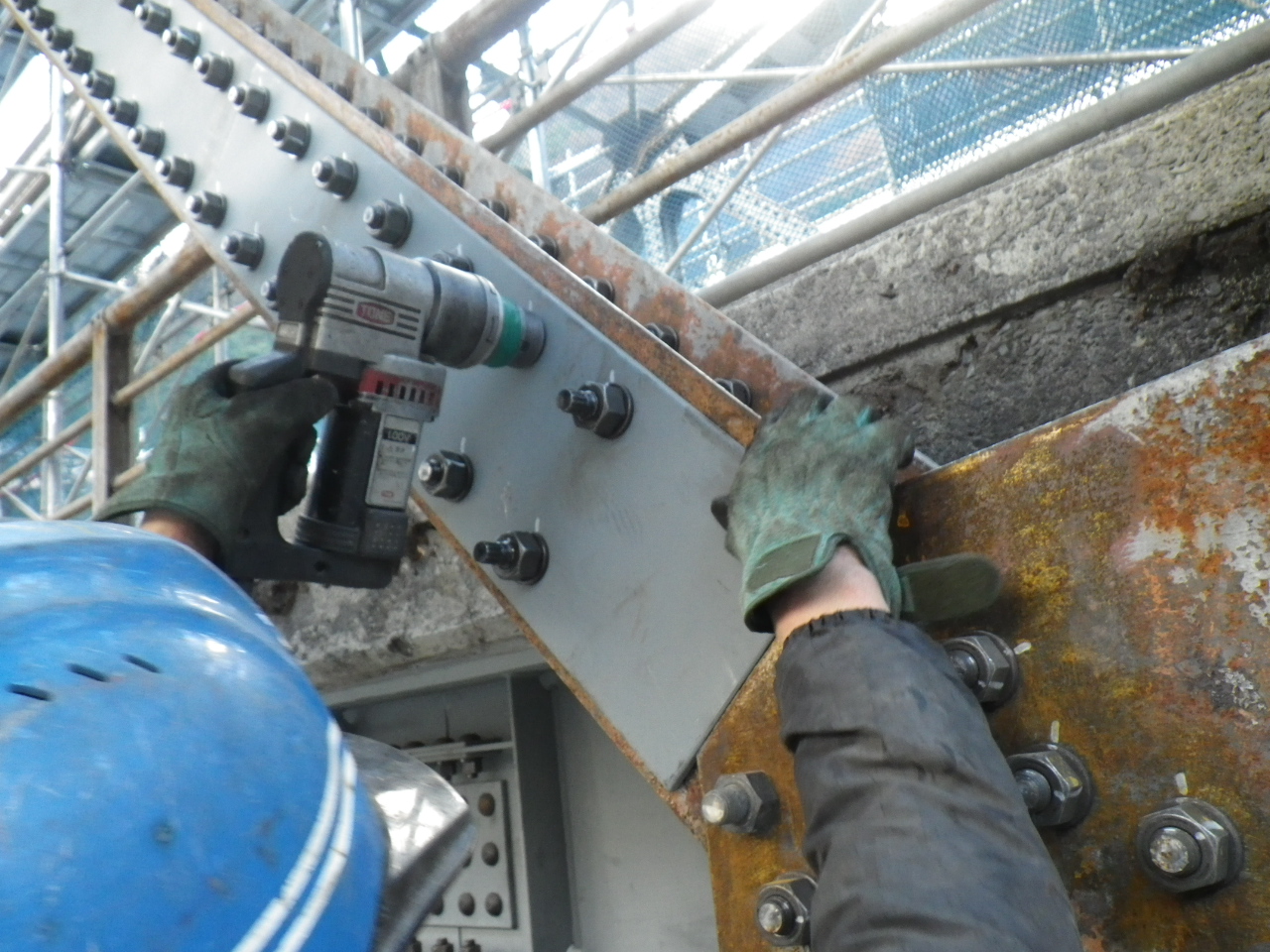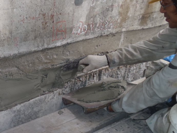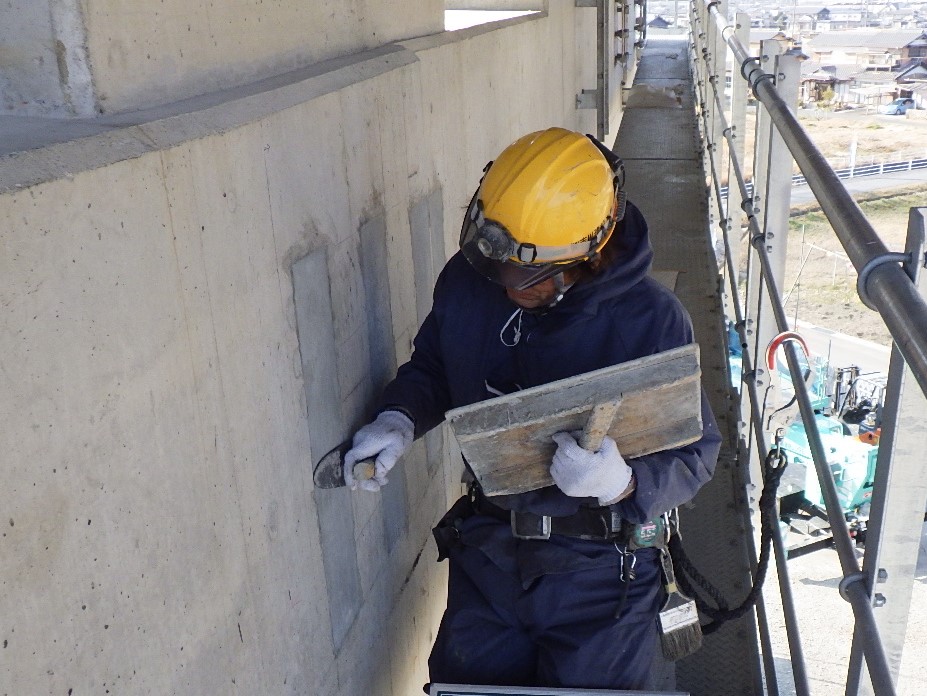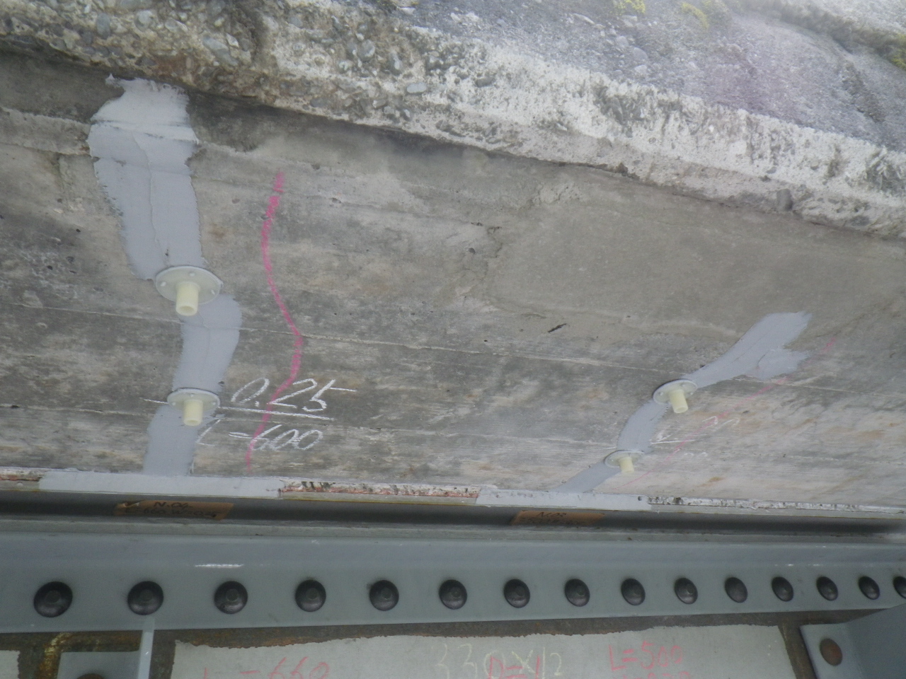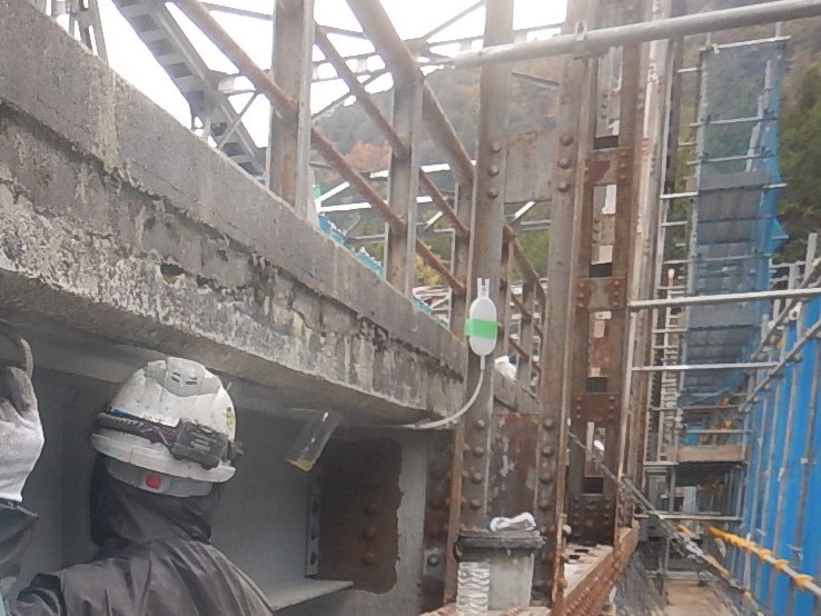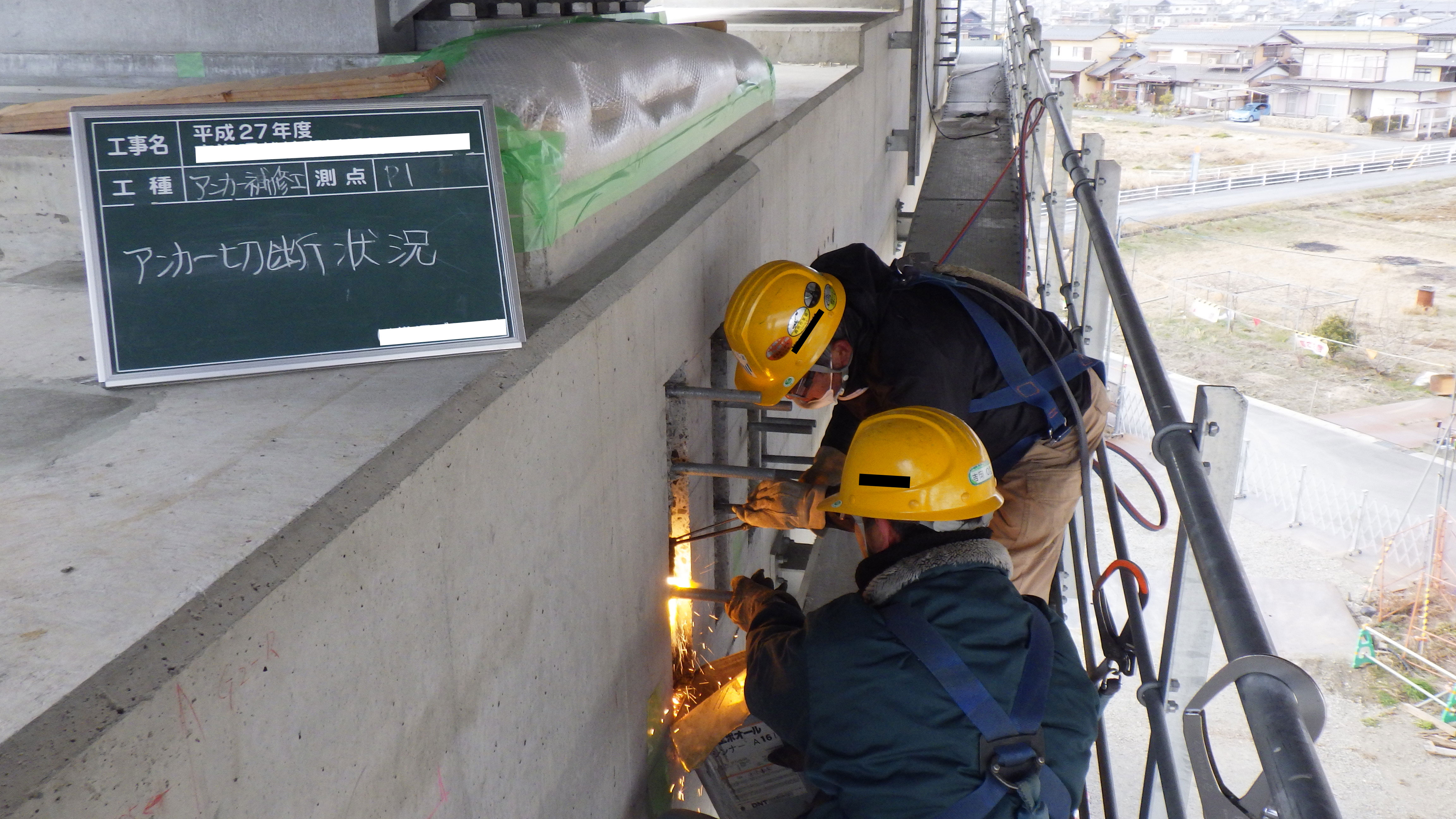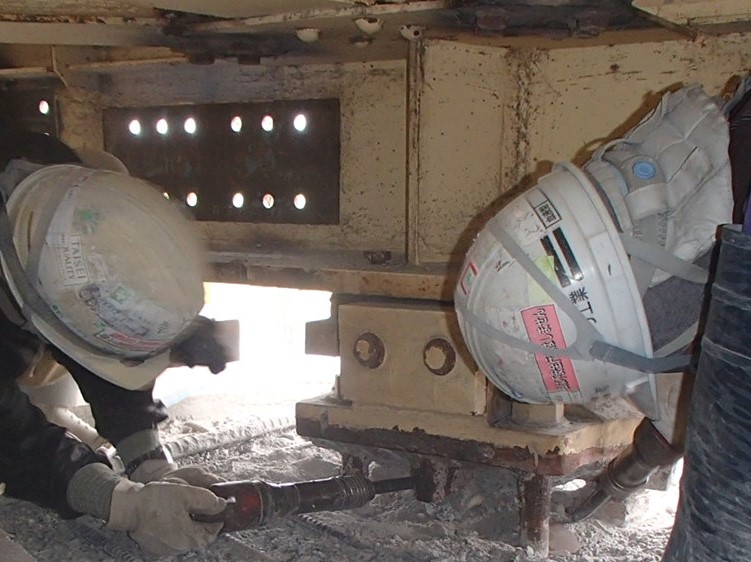 技術内容 橋体補強工 _ 当て板補強 鋼部材が腐食等により減厚したり断面欠損を生じた個所を取り囲むように当て板をあて、補強を行う ▲上部へ戻る 各種繊維シート接着による補強工 炭素繊維・アラミド・剥落防止シートなど各種繊維シートを用いた耐震補強・接触・近接爆発に対する補強・欠落落下防止などを行う ▲上部へ戻る コンクリート構造物補強工 _ ひび割れ注入補修工 コンクリート構造物のひび割れ幅や補修目的に応じ、ひび割れ部に合った材料・工法を選定し注入する。 ▲上部へ戻る 橋体補強工 _ 構造変更による補強工 状況に応じた鋼部材の応力の低減を計る為、補強部材の取付を行う。 ▲上部へ戻る 橋体補強工 _ 鋼鈑接着による補強工 構造物の曲げ・せん断耐力、変形性能を向上させる為、既設構造物に鋼板をあてがい、隙間にモルタル及びエポキシ樹脂を注入する。 ▲上部へ戻る 橋体補強工 _ 支承取替工 経年劣化・機能回復や耐震性能の向上を目的として、既設の支承を取り替える工法 ▲上部へ戻る 橋体補強工 _ 拡幅工 地震の際に橋桁がずれたり、落下しないように各装置を設置。震災時、桁が橋脚や橋台上で進行方向に移動し落下することを防ぐため、桁掛かり 部分を進行方向に増し打ちし拡幅する。 ▲上部へ戻る コンクリート構造物補強工 _ コンクリート脆弱部断面修復工 コンクリート構造物の劣化状況を調査し、劣化部分を斫り撤去し劣化状況に応じた断面修復材にて断面修復を復元する。 ▲上部へ戻る 断面修復工 ▲上部へ戻る 橋体補強工 _ リベット取替工 ▲上部へ戻る 補強用ケーブル設置工 ▲上部へ戻る